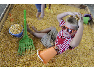While in Colorado, we went to the El Paso County Fair. It was HOT, HOT, HOT outside so we went and found a little shade inside the 4-H building. Bryce found a "sandbox" made out of corn. He had a blast and the photographer from the Colorado Springs Gazette came along and took some pictures of him playing.
